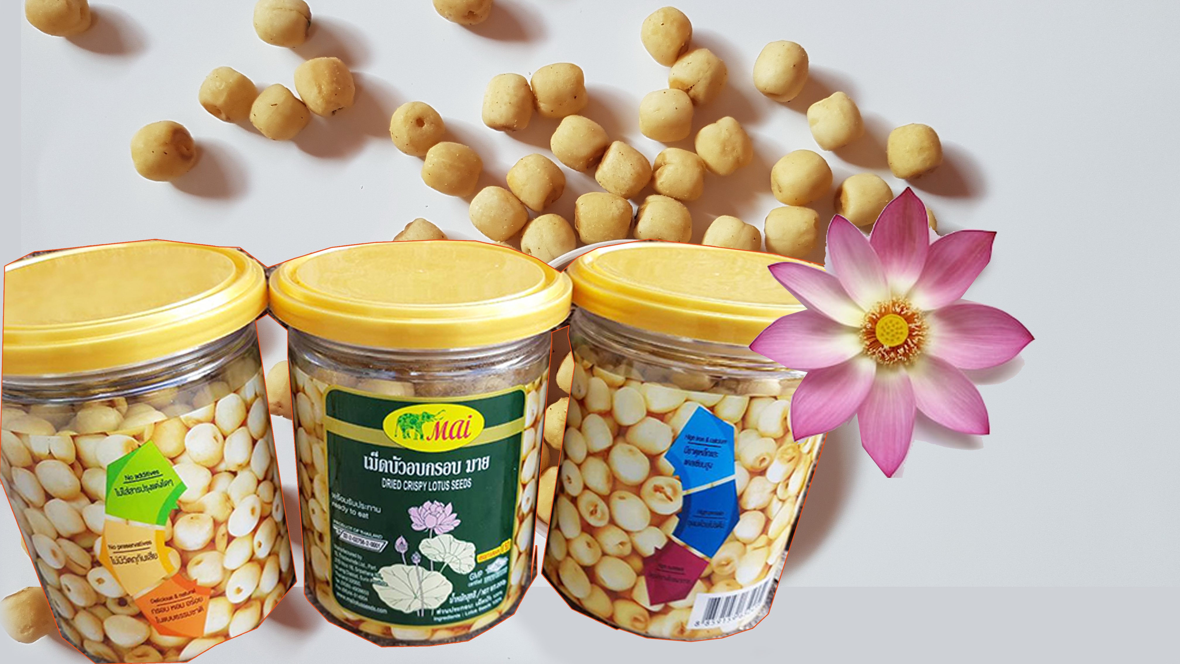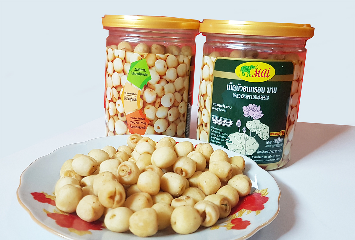 เม็ดบัวอบกรอบ มาย ผลิตจากเม็ดบัวพันธุ์ดี มีคุณค่าทางอาหารสูง ซึ่งประกอบด้วย วิตามินเอ วิตามินซี วิตามินอี เกลือแร่ และ ฟอสฟอรัส อีกทั้งยังมีสรรพคุณทางยาที่ช่วยในการบำรุงหัวใจ บำรุงโลหิต และบำรุงประสาท เหมาะสำหรับเป็นอาหารว่างและของขบเขี้ยวได้ทุกโอกาส